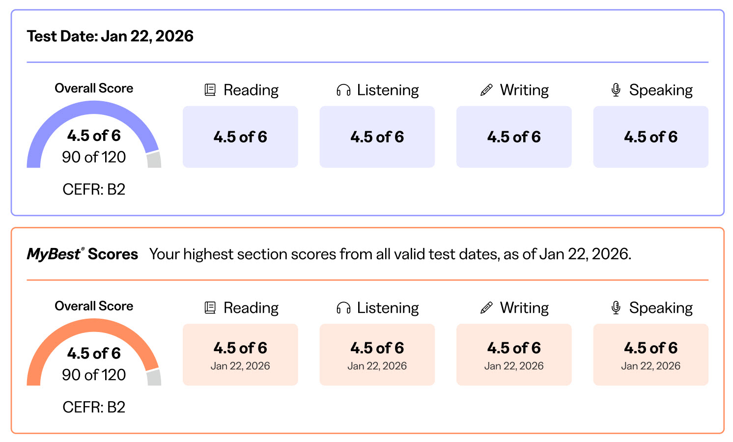 As of January 21, 2026, TOEFL iBT score reports feature a new 1 – 6 scale, in half point increments, with a more intuitive alignment to the Common European Framework of References for Language (CEFR).